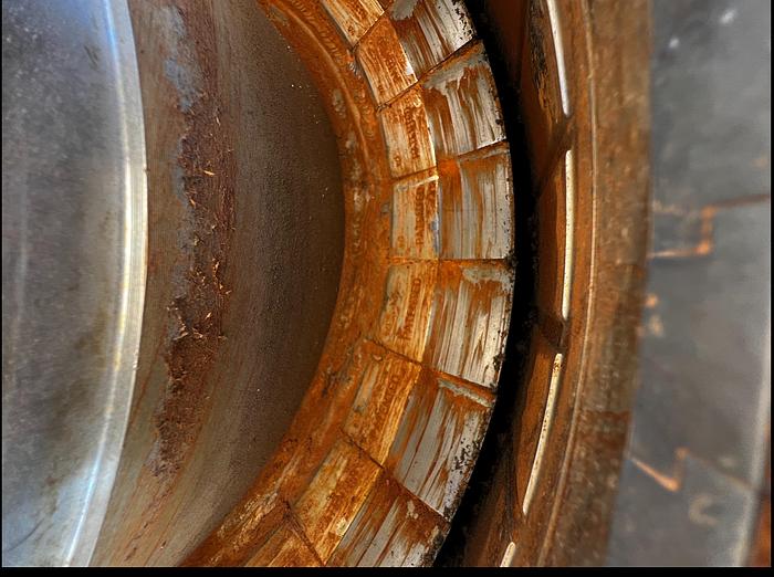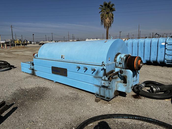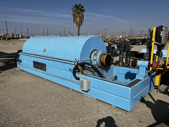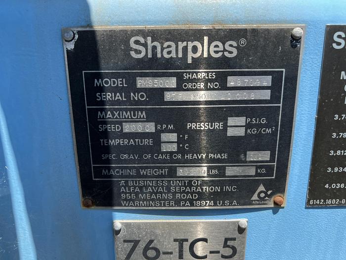 Used-Sharples PM-95000 Super-D-Canter Centrifuge, stainless steel construction on product contact areas. Maximum bowl speed 2000 rpm, 360 degree solid discharge ports with STC liners, 7.6"/13.8" (197 mm/356 mm) single lead conveyor with STC wear protection tiles, 95:1 gearbox, base, casing with stainless steel top cover, 300 HP main drive motor with sub-base, lube system, feed tube, vibration isolators/switch, belt guards. (Please inspect before purchasing to ensure all parts are there)